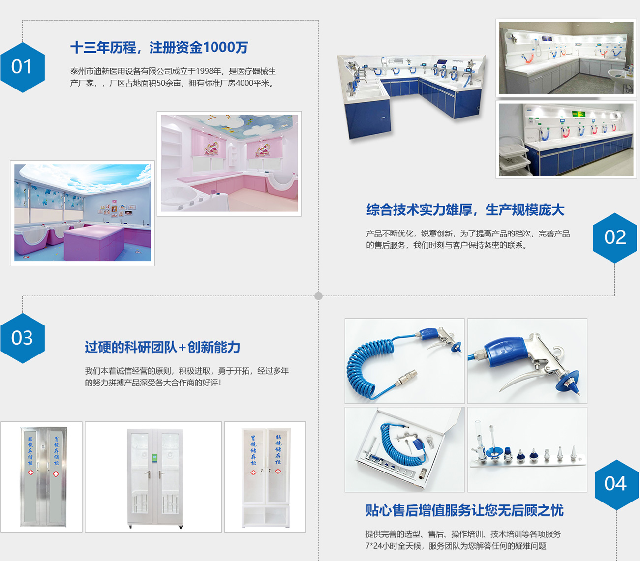 泰州市迪新醫(yī)用設(shè)備有限公司成立于1998年,是醫(yī)療器械生產(chǎn)廠(chǎng)家。公司坐落于江蘇省泰州市新區(qū),廠(chǎng)區(qū)占地面積50余畝,擁有標(biāo)準(zhǔn)廠(chǎng)房4000平米。公司在職各類(lèi)高中級(jí)技術(shù)人員20余名,職工100余名。我公司是以生產(chǎn)內(nèi)窺鏡清洗工作站、內(nèi)鏡清洗槽、內(nèi)窺鏡儲(chǔ)存柜、超聲波清洗器、高壓水槍、電腦吹干機(jī)等為主導(dǎo)產(chǎn)品醫(yī)療器械生產(chǎn)廠(chǎng)家。公司有多年生產(chǎn)設(shè)備的經(jīng)驗(yàn),實(shí)力雄厚,擁有研發(fā)高新產(chǎn)品的能力,完善的加工設(shè)備和齊全的檢測(cè)手段。公司生產(chǎn)的內(nèi)窺鏡清洗工作站經(jīng)上海長(zhǎng)海醫(yī)院、瑞金醫(yī)院、仁濟(jì)醫(yī)院、浙醫(yī)附院、湖南醫(yī)大附屬湘雅醫(yī)院、江蘇省人民醫(yī)院等一大批內(nèi)窺鏡專(zhuān)家使用后一致認(rèn)可,被推廣應(yīng)用。多年來(lái),企業(yè)不斷開(kāi)拓創(chuàng)新,競(jìng)爭(zhēng)拼搏,本著“精心制造、誠(chéng)心服務(wù)、低價(jià)銷(xiāo)售、重守合同、送貨快捷”的宗旨,贏(yíng)得了廣大消費(fèi)者的認(rèn)可。誠(chéng)實(shí)守信、共贏(yíng)進(jìn)取是每個(gè)迪新人的精神基石,我們熱誠(chéng)期盼與各企事業(yè)單位合作俱進(jìn),共創(chuàng)輝煌?,F(xiàn)我公司誠(chéng)招各省市地區(qū)代理商。歡迎各家醫(yī)院來(lái)電來(lái)函洽談!