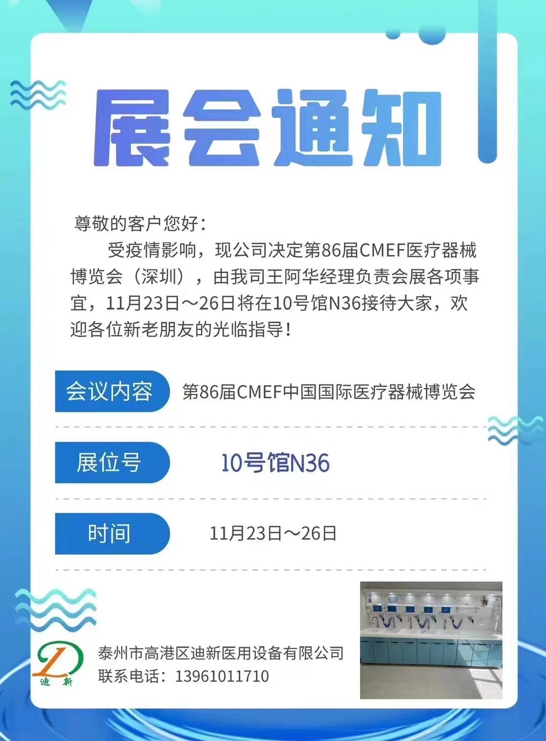 查看詳情尊敬的客戶您好: 受疫情影響,現(xiàn)公司決定第86屆CMEF醫(yī)療器械博覽會(深圳),由我司王阿華經(jīng)理負責會展各項事宜,11月23日~26日將在10號館N36接待大家,歡迎各位新老朋友的光臨指導!......